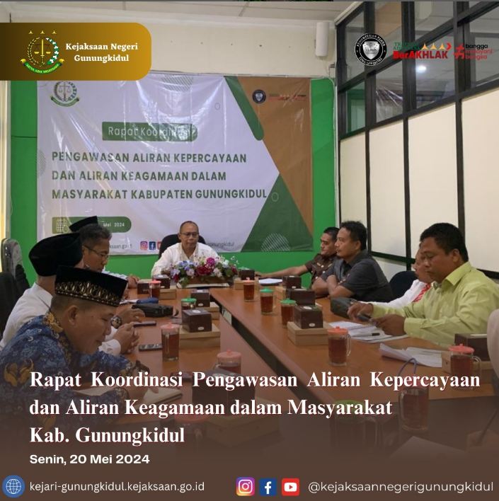 Senin, 20 Mei 2024 telah dilaksanakan Rapat Koordinasi Pengawasan Aliran Kepercayaan dan Aliran Keagamaan dalam Masyarakat Kab. Gunungkidul, bertampat di Ruang Rapat Kejaksaan Negeri Gunungkidul oleh Kejaksaan Negeri Gunungkidul.