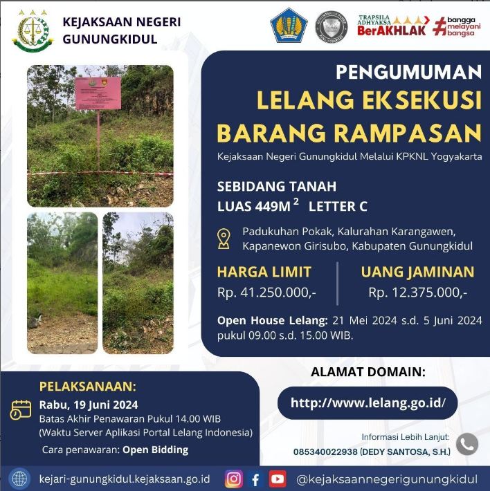 Kejaksaan Negeri Gunungkidul selaku Penjual Lelang dengan perantara Kantor Pelayanan Kekayaan Negara dan Lelang (KPKNL) Yogyakarta akan melaksanakan lelang Eksekusi Barang Rampasan sebagai berikut : Sebidang Tanah seluas 449m2 Letter C yang terletak di Padukuhan Pokak, Kalurahan Karangawen, Kapanewon Giri Subo, Kabupaten Gunungkidul, tercatat a.n. Pokarto. Nilai Limit Sebesar Rp. 41.250.000,- dan Uang Jaminan Sebesar Rp. 12.375.000,-. Lelang dilaksanakan pada hari Rabu 19 Juni 2024, Batas Akhir Penawaran Pukul 14.00 WIB, Waktu Server Aplikasi Portal Lelang Indonesia, Alamat Domain : http://www.lelang.go.id/
