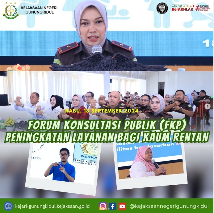 Kajati DIY Ahelya Abustam, S.H., M.H., membuka acara Forum Konsultasi Publik (FKP) Peningkatan Pelayanan Bagi Kaum Rentan, Rabu (18/9/2024) bertempat di Aula Kejaksaan Tinggi DIY, yang diikuti para Asisten, Kabag TU, Koordinator, Kasubbag dan staf pada Kejaksaan Tinggi DIY dan Kejaksaan Negeri se- DIY.