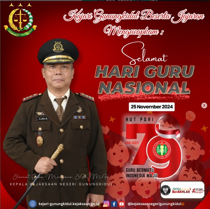 Kepala Kejaksaan Negeri Gunungkidul beserta jajaran mengucapkan Selamat Hari Guru Nasional Tahun 2024.