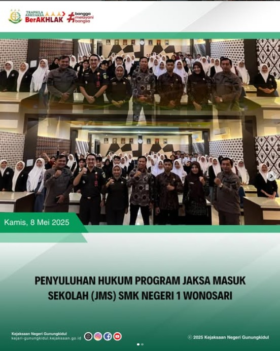 Hari Kamis, 8 Mei 2025 telah dilaksanakan kegiatan Penyuluhan Hukum Program Jaksa Masuk Sekolah (JMS) pada SMK Negeri 1 Wonosari.