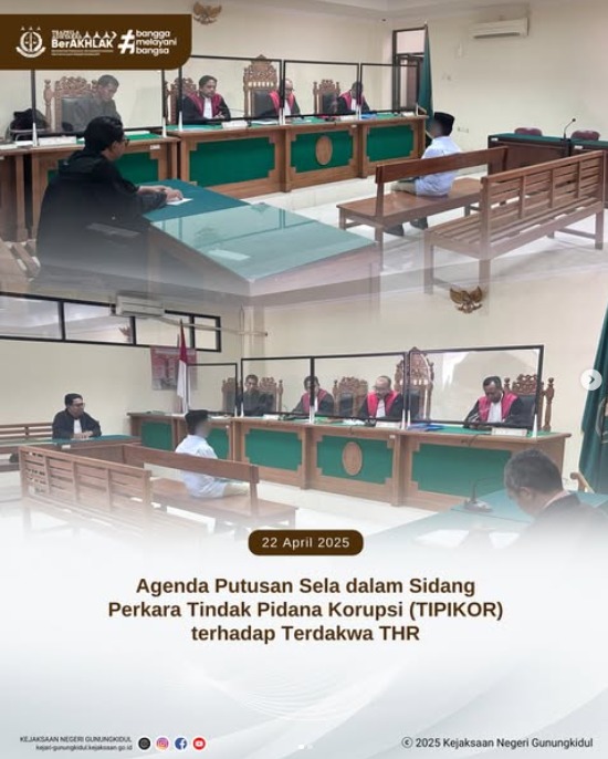 Pada hari Selasa, tanggal 22 April 2025 telah dilaksanakan Agenda Putusan Sela dalam Sidang Perkara Tindak Pidana Korupsi (TIPIKOR) terhadap Terdakwa THR bertempat di Pengadilan Tindak Pidana Korupsi dan Hubungan Industrial Yogyakarta pada pukul 10.00 WIB.