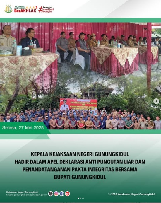 Pada hari Selasa, tanggal 27 Mei 2025 Kepala Kejaksaan Negeri Gunungkidul, Slamet Jaka Mulyana, S.H., M.H. bersama jajaran Forkopimda hadir dalam Apel Deklarasi Anti Pungutan Liar dan Penandatanganan Pakta Integritas Bersama Bupati Gunungkidul.