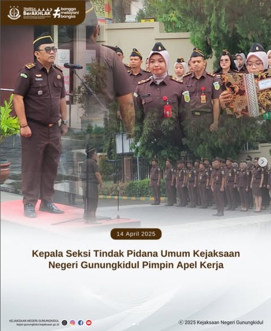 Senin, 14 April 2025 Kejaksaan Negeri Gunungkidul melaksanakan apel kerja rutin. Apel dipimpin oleh Kepala Seksi Tindak Pidana Umum Kejaksaan Negeri Gunungkidul, Raka Buntasing Panjongko, S.H.,M.H.Li. dengan diikuti oleh para Kasi, Jaksa Fungsional, dan seluruh jajaran Kejaksaan Negeri Gunungkidul.