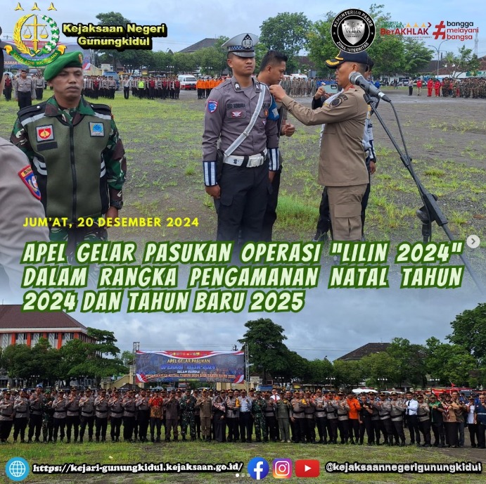 Kepala Kejaksaan Negeri Gunungkidul menghadiri Apel Gelar Pasukan Operasi “Lilin 2024” Dalam Rangka Pengamanan Natal Tahun 2024 Dan Tahun Baru 2025, di Alun-alun Pemda Kab. Gunungkidul. Jum’at(20/12/2024)