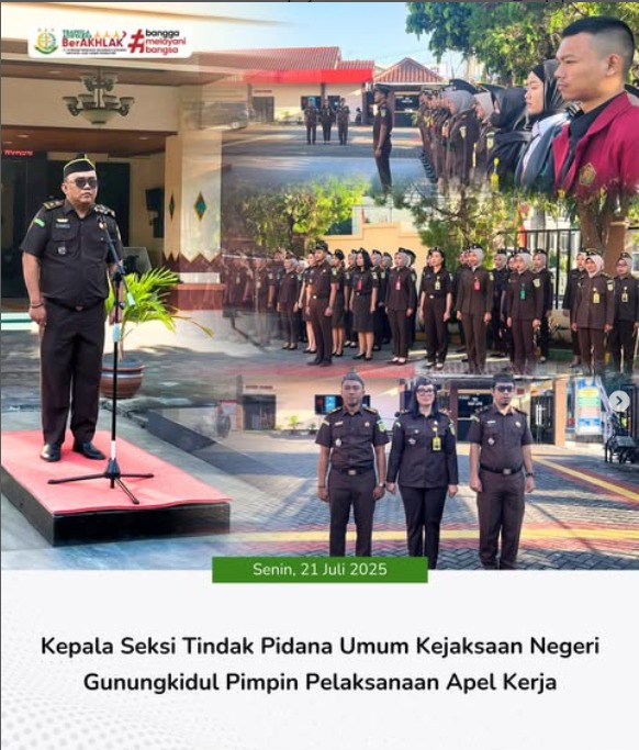 Hari Senin, tanggal 21 Juli 2025 Kejaksaan Negeri Gunungkidul melaksanakan Apel Kerja Rutin. Apel dipimpin oleh Kepala Seksi Tindak Pidana Umum Kejaksaan Negeri Gunungkidul, Raka Buntasing Panjongko, S.H., M.HLi. Apel diikuti oleh para Kasi, Jaksa Fungsional dan seluruh jajaran Kejaksaan Negeri Gunungkidul.