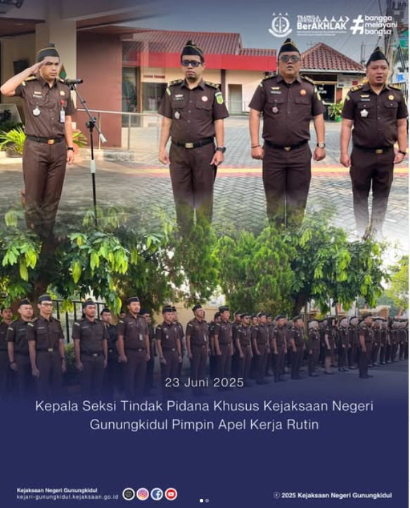 Pada hari Senin, tanggal 23 Juni 2025 Kepala Seksi Tindak Pidana Khusus Kejaksaan Negeri Gunungkidul, Alfian Listya Kurniawan, S.H., M.H. pimpin pelaksanaan apel kerja rutin. Apel diikuti oleh para Kasi, Jaksa Fungsional, dan seluruh jajaran Kejaksaan Negeri Gunungkidul.