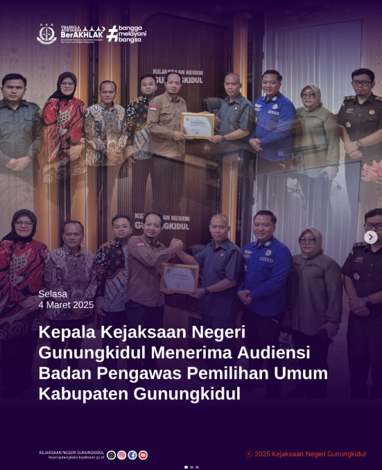 Kepala Kejaksaan Negeri Gunungkidul, Slamet Jaka Mulyana, S.H., M.H. didampingi oleh Kasi PAPBB, Kasi Perdata dan TUN, serta Kasubsi A Intelijen menerima audiensi dari Badan Pengawas Pemilihan Umum Kabupaten Gunungkidul, Selasa (04/03/2025) bertempat di Ruang Tamu Kajari Gunungkidul.