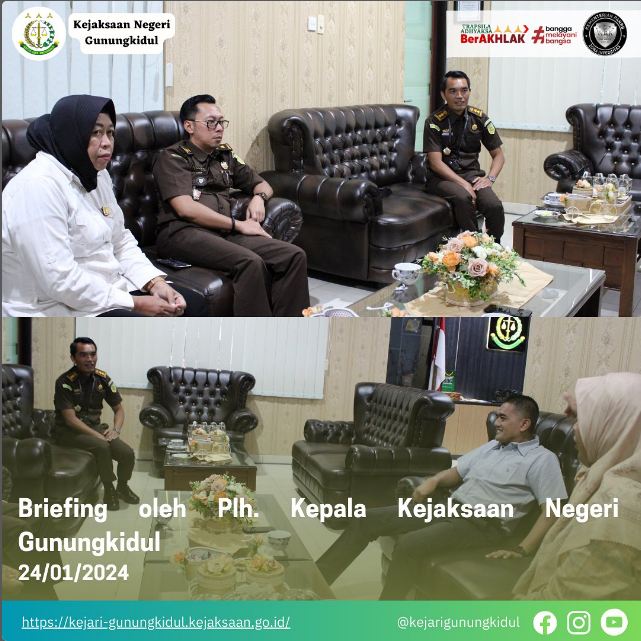 Rabu, 24 Januari 2024 di laksanakan Briefing Rutin oleh Plh. Kepala Kejaksaan Negeri Gunungkidul Budhi Purwanto, S.H.,M.H. bersama Kasi serta Kasubagbin Kejari Gunungkidul, bertempat di Kantor Kejari Gunungkidul.