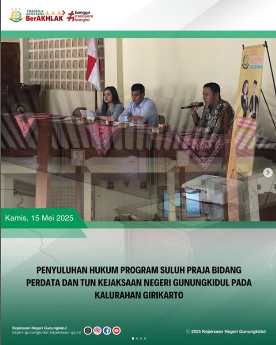 Pada hari ini Kamis, 15 Mei 2025 bertempat di Balai Kalurahan Girikarto, Kapanewon Panggang, Kab. Gunungkidul, Heri Setiawan, S.H., M.H. Selaku Kepala Subseksi Perdata dan TUN bersama dengan Ni Made Sukreni Gadis Bali, S.H. Selaku Kepala Subseksi Pertimbangan Hukum telah melaksanakan Kegiatan Datun Suluh Praja.
