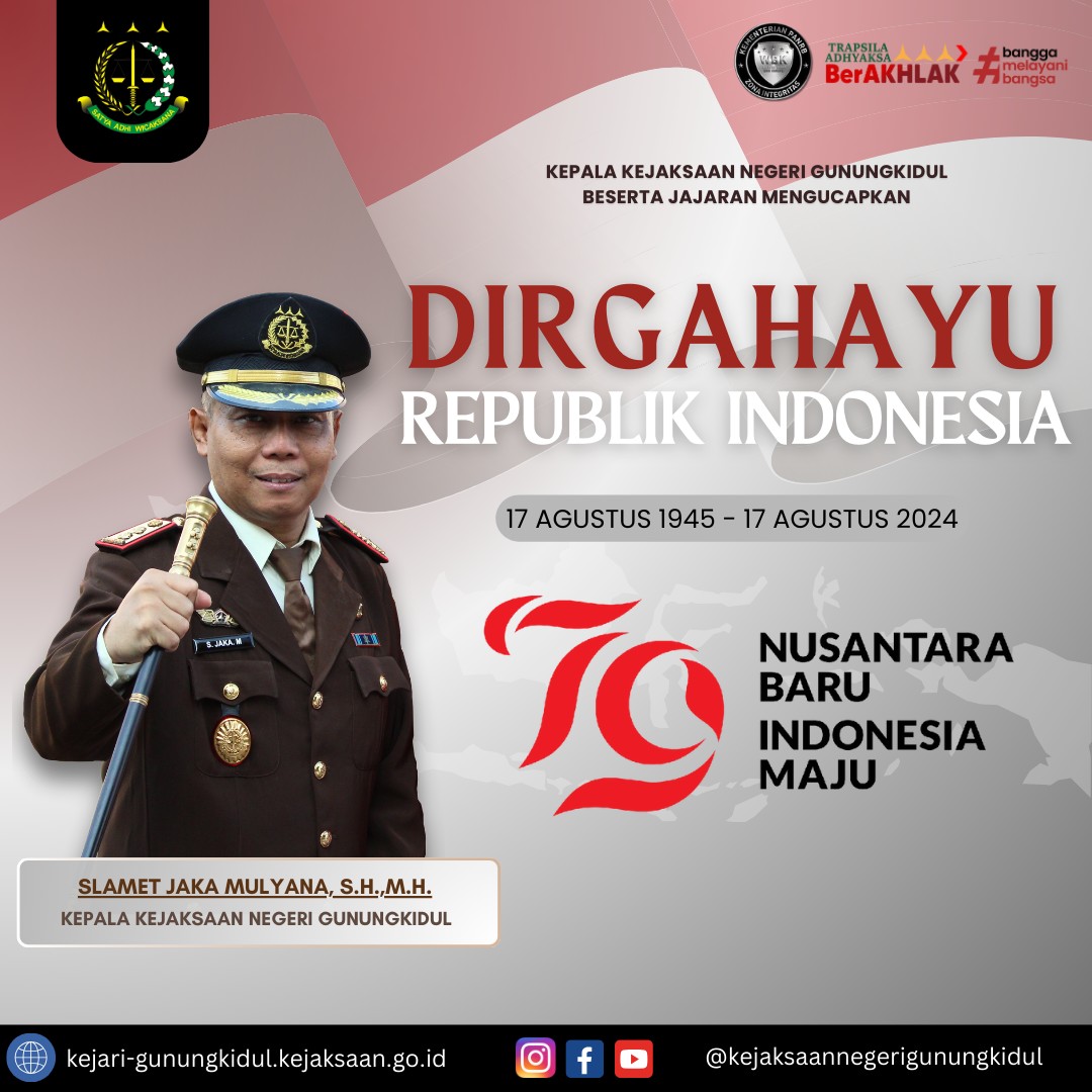 Dirgahayu Republik Indonesia ke-79 19/08/2024oleh admin-1658 Dilihatoleh admin Kepala Kejaksaan Negeri Gunungkidul beserta jajaran mengucapkan Dirgahayu Republik Indonesia ke-79 Tahun 2024. “Nusantara Baru Indonesia Maju” 17 Agustus 2024 Post Views: 1,658 Jangan LewatkanPenyuluhan HukumNegosiasi dengan PKBU (Pemberi Kerja / Badan Usaha)Apel PagiNegosiasi dengan DebiturOlahraga Bersepeda Santai