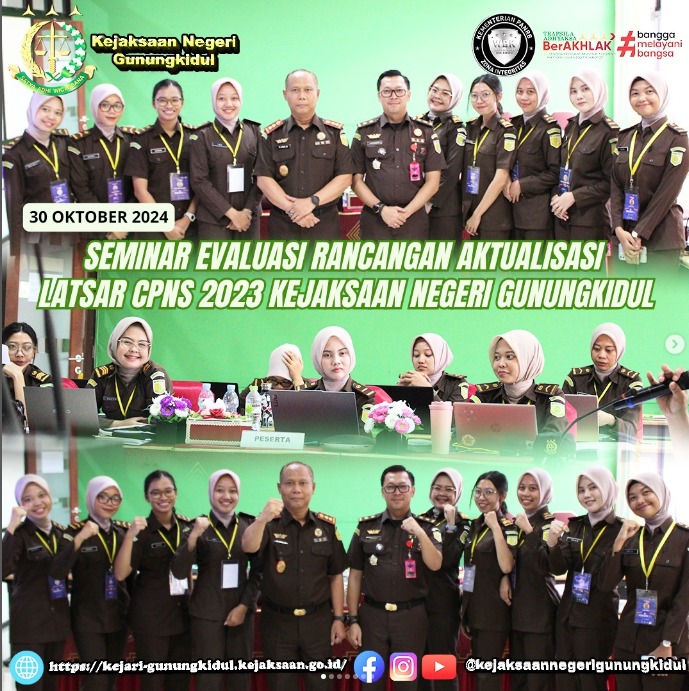 Kepala Kejaksaan Negeri Gunungkidul Slamet Jaka Mulyana, S.H.,M.H. bersama Para Kasi Kejari Gunungkidul hadir sebagai penguji serta mentor dalam kegiatan Evaluasi Rancangan Aktualisasi Latsar CPNS 2023 Golongan II dan III, di Aula Kantor Kejari Gunungkidul. Rabu(31/10/2024)