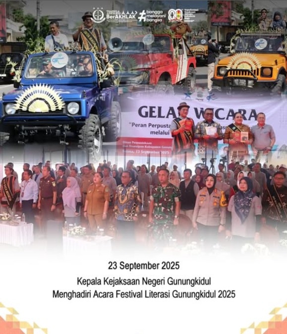 Kepala Kejaksaan Negeri Gunungkidul, Bapak Agung Sugiharto, S.Kom., S.H., hari ini, Selasa, 23 September 2025 , telah menghadiri undangan Puncak Acara Festival Literasi Kabupaten Gunungkidul Tahun 2025. Acara ini diselenggarakan oleh Dinas Perpustakaan dan Kearsipan Kabupaten Gunungkidul bekerja sama dengan Perpustakaan Nasional RI.