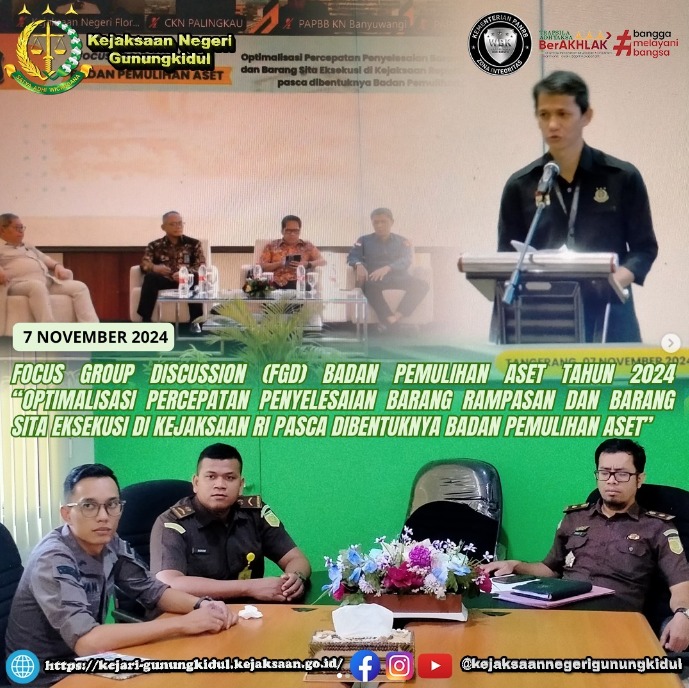Kasi PB3R Kejari Gunungkidul bersama Staff PB3R Kejari Gunungkidul mengikuti secara virtual melalui zoom meeting Focus Group Discussion (FGD) Badan Pemulihan Aset Tahun 2024 “Optimalisasi Percepatan Penyelesaian Barang Rampasan dan Barang Sita Eksekusi di Kejaksaan RI Pasca dibentuknya Badan Pemulihan Aset”, di ruang rapat Kejari Gunungkidul. Kamis(7/11/2024)