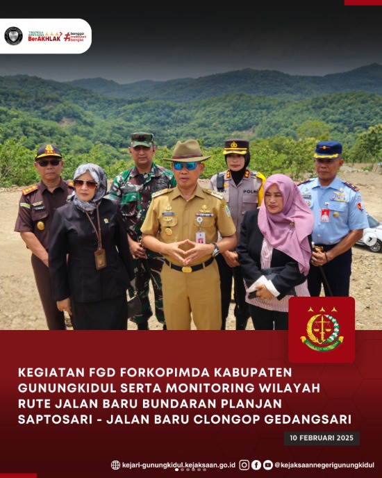 Kepala Kejaksaan Negeri Gunungkidul, Slamet Jaka Mulyana, S.H., M.H. bersama dengan jajaran Forkopimda hadir dalam kegiatan Focus Group Discussion (FGD) Forkopimda Kabupaten Gunungkidul serta Monitoring Wilayah Rute Bundaran Planjan Saptosari – Jalan Baru Clongop Gedangsari. Kegiatan telah dilaksanakan pada hari Senin, 10 Februari 2025.