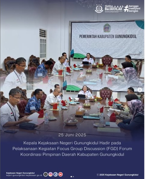Kepala Kejaksaan Negeri Gunungkidul, Slamet Jaka Mulyana, S.H., M.H. bersama jajaran Forkopimda hadir dalam pelaksanaan kegiatan Focus Group Discussion (FGD) Forum Koordinas Pimpinan Daerah Kabupaten Gunungkidul. Kegiatan FGD dilaksanakan pada hari Rabu, 26 Juni 2025 bertempat di Rumah Dinas Bupati Gunungkidul.