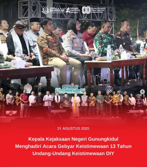 Pada hari Minggu, 31 Agustus 2025, Kepala Kejaksaan Negeri Gunungkidul, Agung Sugiharto, S.Kom., S.H., bersama jajaran Forum Koordinasi Pimpinan Daerah (Forkopimda) menghadiri acara Gebyar Keistimewaan 13 Tahun Undang-Undang Keistimewaan Daerah Istimewa Yogyakarta (DIY). Acara tersebut diselenggarakan di Alun-Alun Wonosari, Kabupaten Gunungkidul.