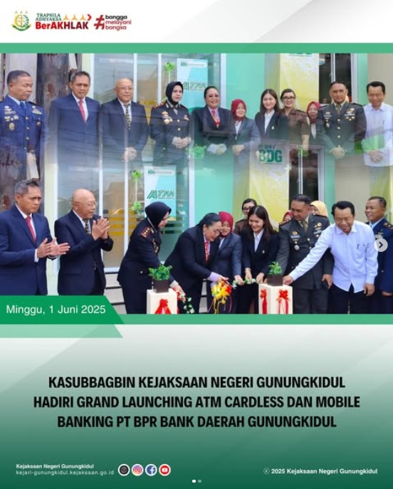 Kasubbagbin Kejaksaan Negeri Gunungkidul V.A. Fransisca Mayasari D., S.H., M.H., wakili Kejaksaan Negeri Gunungkidul hadiri acara Grand Launching ATM Cardless dan Mobile Banking PT BPR Bank Daerah Gunungkidul bertempat di Kantor Pusat PT BPR Bank Daerah Gunungkidul (Perseroda) pada hari Minggu, 1 Juni 2025.