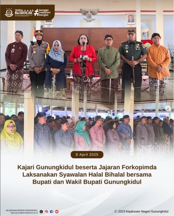 Kepala Kejaksaan Negeri Gunungkidul, Slamet Jaka Mulyana, S.H., M.H. beserta Jajaran Forkopimda Laksanakan Syawalan Halal Bihalal bersama Bupati dan Wakil Bupati Gunungkidul pada hari Selasa, 8 April 2025 bertempat di Bangsal Sewokoprojo Wonosari. Kegiatan turut diikuti oleh seluruh jajaran ASN, BUMD, serta Lurah se-Gunungkidul.