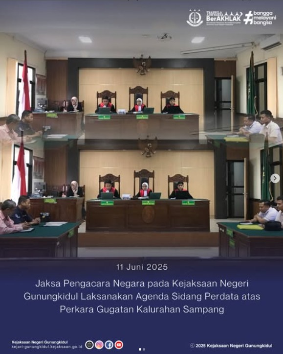 Pada hari Rabu, tanggal 11 Juni 2025 bertempat di Ruang Sidang pada Pengadilan Negeri Wonosari, Tomy Novendri, S.H., M.Kn., bersama dengan Heri Setiawan, S.H., M.H. selaku Jaksa Pengacara Negara telah melaksanakan persidangan mewakili Pemerintah Kalurahan Sampang dalam kedudukannya sebagai Tergugat, Turut Tergugat IV dan V terhadap Perkara Perdata No.9/Pdt.G/2025/PN Wno dengan agenda Pemeriksaan Bukti Surat para pihak.