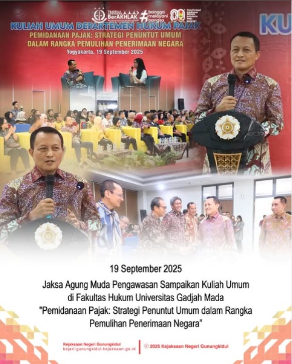 Kepala Kejaksaan Negeri Gunungkidul, Agung Sugiharto, S.Kom., S.H., menghadiri kegiatan Kuliah Umum yang diselenggarakan oleh Departemen Hukum Pajak Fakultas Hukum Universitas Gadjah Mada (UGM). Kegiatan ini digelar pada pada hari Jumat (19/09/2025) bertempat di Auditorium Gedung B Fakultas Hukum UGM, dengan mengusung tema “Pemidanaan Pajak: Strategi Penuntut Umum dalam Rangka Pemulihan Penerimaan Negara.”