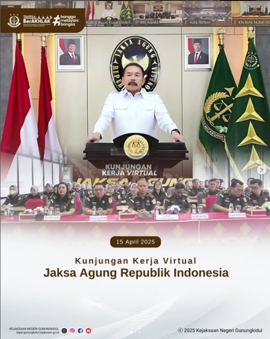 Selasa (15/04/2025) Kejaksaan Negeri Gunungkidul mengikuti Kunjungan Kerja virtual Jaksa Agung Kejaksaan Republik Indonesia via Zoom Meeting. Kegiatan diikuti oleh Kepala Kejaksaan Negeri Gunungkidul, jajaran Kasi dan Kasubag, serta para pegawai. Kunjungan Kerja virtual Jaksa Agung dilaksanakan dalam rangka konsolidasi dan peningkatan kinerja.