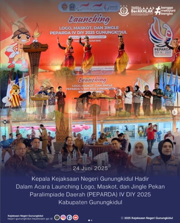 Kepala Kejaksaan Negeri Gunungkidul, Slamet Jaka Mulyana, S.H., M.H. bersama jajaran Forkopimda hadir dalam acara Launching Logo, Maskot, dan Jingle Pekan Paralimpiade Daerah (PEPARDA) IV DIY 2025 Kabupaten Gunungkidul. Acara diselenggarakan pada hari Selasa, tanggal 25 Juni 2025 bertempat di Pendopo Taman Budaya Gunungkidul.