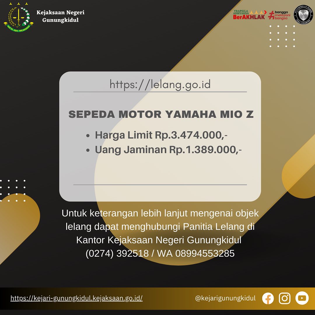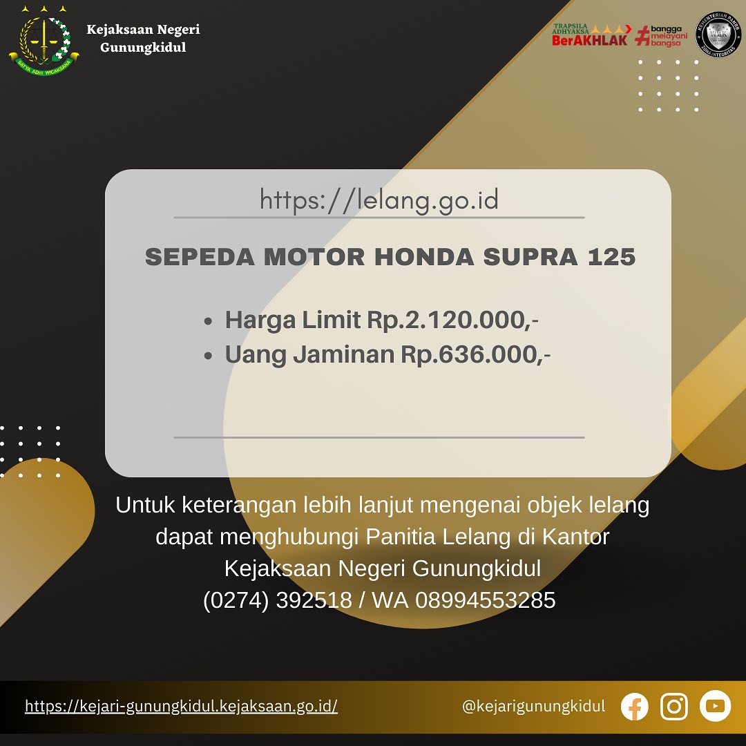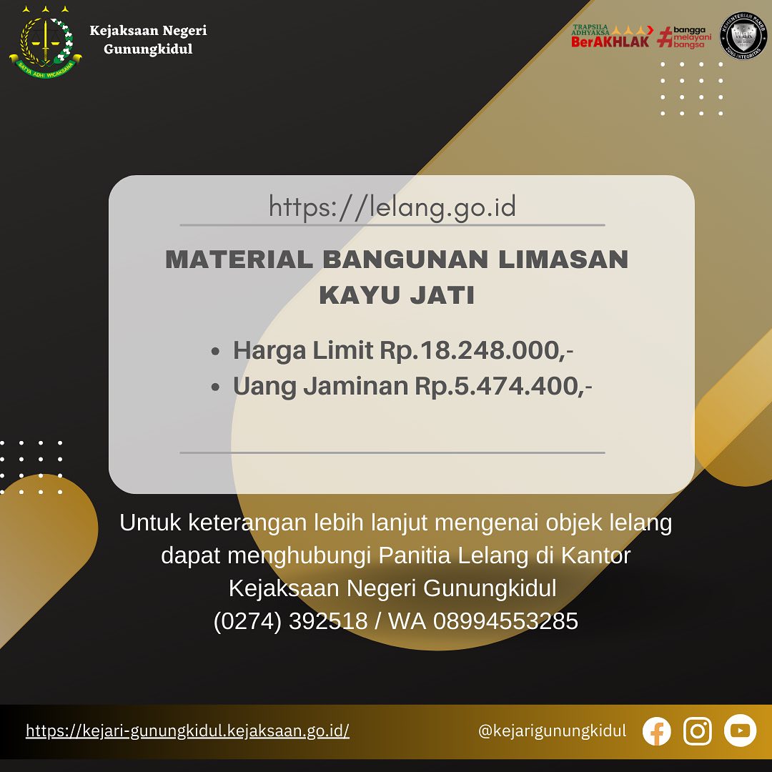 Kejaksaan Negeri Gunung Kidul dengan perantara Kantor Pelayanan Kekayaan Negara dan Lelang (KPKNL) Yogyakarta akan melaksanakan menjual/lelang eksekusi Barang Rampasan yang telah mempunyai kekuatan hukum tetap dengan penawaran secara tertutup (closed bidding) melalui E-Auction, tanpa kehadiran peserta lelang pada alamat domain www.lelang.go.id berupa 3 (tiga) unit sepeda motor dan 1 (satu) bangunan limasan kayu jati.