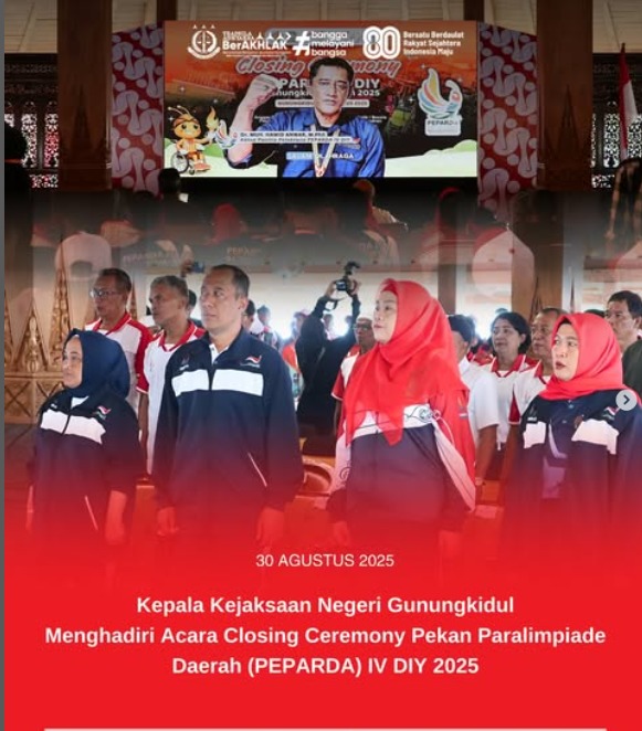 Sabtu (30/08/2025) Kepala Kejaksaan Negeri Gunungkidul, Agung Sugiharto, S.Kom., S.H., bersama jajaran Forkopimda Gunungkidul menghadiri acara Closing Ceremony Pekan Paralimpiade Daerah (PEPARDA) IV DIY 2025 yang berlangsung di Taman Budaya Gunungkidul.