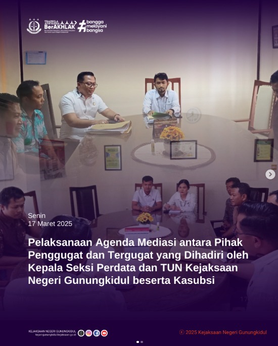 Pada hari Senin, tanggal 17 Maret 2025 telah dilaksanakan agenda Mediasi Penggugat dan Tergugat yang dihadiri oleh Kepala Seksi Perdata dan TUN Kejaksaan Negeri Gunungkidul, Tomy Novendri, S.H., M.Kn. didampingi oleh Kasubsi. Kegiatan dilaksanakan di Pengadilan Negeri Wonosari.