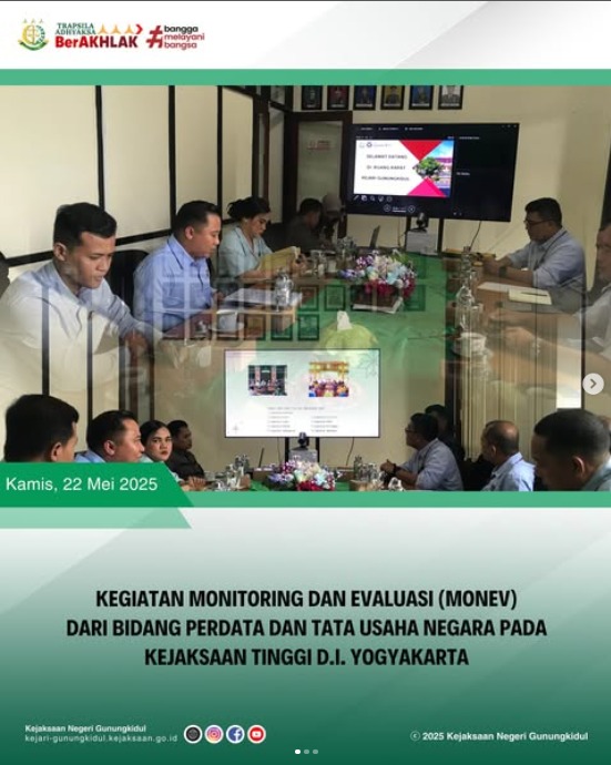 Pada hari ini Kamis, tanggal 22 Mei 2025 bertempat di Kantor Pengacara Negara pada Kejaksaan Negeri Gunungkidul, Kepala Seksi Perdata dan Tata Usaha Negara (Datun) bersama dengan Kepala Subseksi Datun dan Pertimbangan Hukum telah melaksanakan kegiatan monitoring dan evaluasi dari Bidang Datun pada Kejaksaan Tinggi Daerah Istimewa Yogyakarta, adapun kegiatan ini bertujuan untuk meningkatkan efektivitas dan efisiensi dalam penanganan perkara Datun serta mengevaluasi capaian kinerja Bidang Datun, mengidentifikasi kendala dan tantangan, serta mencari solusi pada Kejaksaan Negeri di wilayah Kejaksaan Tinggi Daerah Istimewa Yogyakarta.