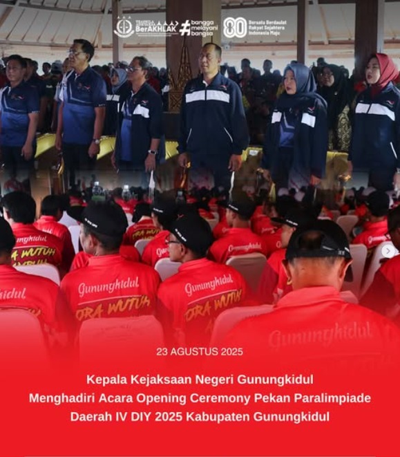 Pada hari Sabtu, tanggal 23 Agustus 2025 Kepala Kejaksaan Negeri Gunungkidul, Agung Sugiharto, S.Kom., S.H. bersama jajaran Forkopimda menghadiri acara Opening Ceremony Pekan Paralimpiade Daerah (Peparda) IV DIY 2025 Kabupaten Gunungkidul. Acara bertempat di Taman Budaya Gunungkidul, Kapanewon Playen.