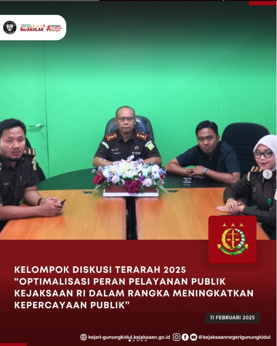 Kepala Kejaksaan Negeri Gunungkidul, Slamet Jaka Mulyana, S.H., M.H. didampingi oleh Kasi Intelijen dan staf melaksanakan kegiatan Kelompok Diskusi Terarah Tahun 2025 yang mengusung tema “Optimalisasi Peran Pelayanan Publik Kejaksaan RI Dalam Rangka Meningkatkan Kepercayaan Publik”, pada hari Selasa (11/02/2025) bertempat di Ruang Rapat Kejaksaan Negeri Gunungkidul. Kegiatan diselenggarakan oleh Pusat Penerangan Hukum Kejaksaan Agung secara virtual melalui zoom meeting.
