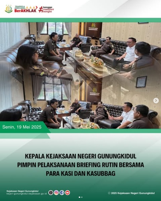 Hari Senin, 19 Mei 2025 Kepala Kejaksaan Negeri Gunungkidul, Slamet Jaka Mulyana, S.H., M.H. pimpin pelaksanaan briefing rutin yang diikuti oleh para Kasi dan Kasubbag. Briefing dilaksanakan di Ruang Kajari Gunungkidul.