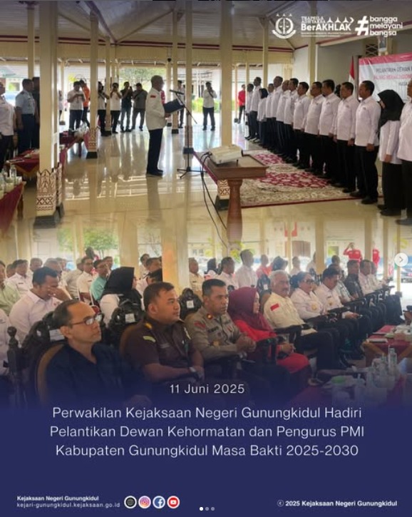 Perwakilan Kejaksaan Negeri Gunungkidul Hadiri Pelantikan Dewan Kehormatan dan Pengurus PMI Kabupaten Gunungkidul Masa Bakti 2025-2030 pada Rabu (11/06/2025) bertempat di Bangsal Sewokoprojo, Wonosari, Gunungkidul.