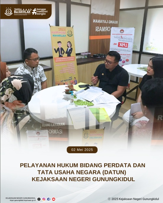 Pelayanan hukum Datun (Perdata dan Tata Usaha Negara) adalah layanan yang diberikan oleh Jaksa Pengacara Negara (JPN) di Kejaksaan Negeri Gunungkidul. Bahwa untuk membantu masyarakat dalam masalah perdata dan tata usaha negara, pelayanan ini meliputi konsultasi, bantuan hukum, pertimbangan hukum, dan tindakan hukum lain, yang bertujuan untuk menegakkan hukum, mempermudah akses masyarakat terhadap layanan hukum, dan mencegah pelanggaran hukum