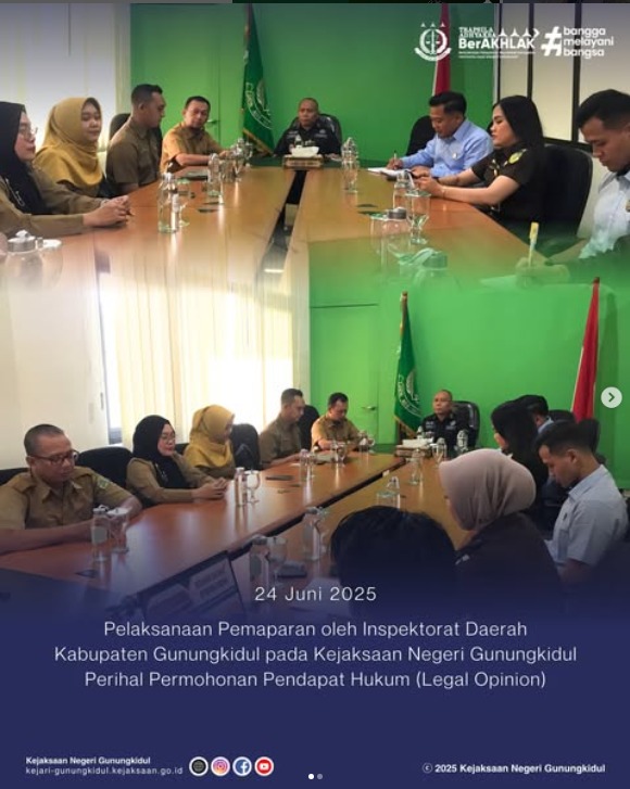 Pada hari, Selasa tanggal 24 Juni 2025 bertempat di Ruang Rapat Kantor Kejaksaan Negeri Gunungkidul, Kepala Kejaksaan Negeri Gunungkidul, Slamet Jaka Mulyana, S.H., M.H., selaku Pengacara Negara bersama dengan Tim Jaksa Pengacara Negara telah menerima pelaksanaan Pemaparan dari Inspektorat Daerah Kabupaten Gunungkidul sehubungan dengan Permohonan Pendapat Hukum (Legal Opinion) yang telah dimohonkan.