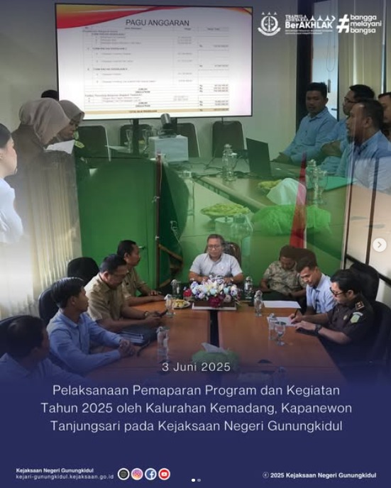 Pada hari Selasa, 3 Juni 2025 bertempat di Ruang Rapat Kejaksaan Negeri Gunungkidul, Tim Jaksa Pengacara Negara telah menerima Pemaparan Program dan Kegiatan Tahun 2025 oleh Kalurahan Kemadang, Kapanewon Tanjungsari, Kabupaten Gunungkidul sehubungan dengan Permohonan Pendampingan Hukum terhadap kegiatan-kegiatan yang telah dimohonkan.