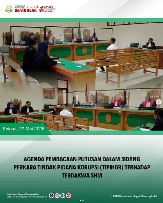 Pada hari Selasa, tanggal 27 Mei 2025 telah dilaksanakan Agenda Pembacaan Putusan dalam Sidang Perkara Tindak Pidana Korupsi (TIPIKOR) terhadap Terdakwa SHM. Agenda sidang bertempat di Pengadilan Tindak Pidana Korupsi dan Hubungan Industrial Yogyakarta.