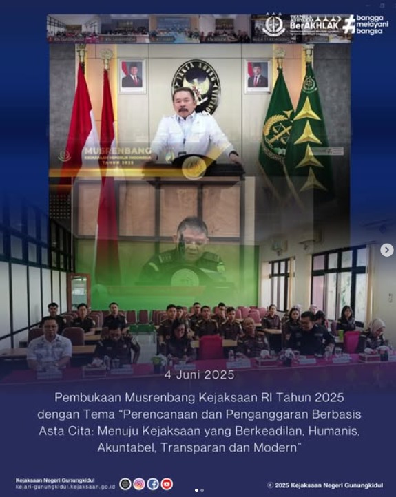 Pada hari Rabu, tanggal 4 Juni 2025 bertempat di Aula Kejaksaan Negeri Gunungkidul, Kepala Kejaksaan Negeri Gunungkidul, Slamet Jaka Mulyana, S.H., M.H. dengan didampingi oleh jajaran Kasi dan Kasubbag melaksanakan Pembukaan Musrenbang Kejaksaan RI Tahun 2025 dengan Tema “Perencanaan dan Penganggaran Berbasis Asta Cita: Menuju Kejaksaan yang Berkeadilan, Humanis, Akuntabel, Transparan dan Modern” secara virtual melalui zoom meeting. Kegiatan dilaksanakan di Aula Kantor Kejaksaan Negeri Gunungkidul.