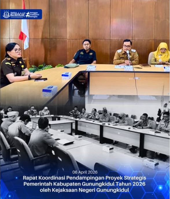 Kasi Intelijen Kejari Gunungkidul, Surya Hermawan, S.H., M.H., bersama Kasubsi Pendampingan Hukum Kejari Gunungkidul, Ni Made Sukreni Gadis Bali, S.H., M.H., mengikuti kegiatan Rapat Koordinasi Pendampingan Proyek Strategis Pemerintah Kabupaten Gunungkidul Tahun 2026 oleh Kejaksaan Negeri Gunungkidul bersama Pemda Kabupaten Gunungkidul, pada Senin (6/4/2026) bertempat di Ruang Rapat Dhaksinarga Setda Kabupaten Gunungkidul. Kegiatan ini dilaksanakan sebagai tindak lanjut atas permohonan pendampingan terhadap Paket Pekerjaan Strategis Kabupaten Gunungkidul Tahun 2026 yang telah diajukan kepada Kejaksaan Negeri Gunungkidul.