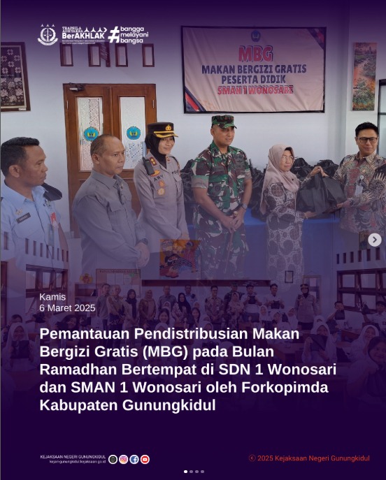 Kamis (06/03/2025) Kepala Kejaksaan Negeri Gunungkidul, Slamet Jaka Mulyana, S.H., M.H. bersama dengan jajaran Forkopimda Kabupaten Gunungkidul melaksanakan kegiatan Pemantauan Pendistribusian Makan Bergizi Gratis (MBG) pada Bulan Ramadhan Bertempat di SDN 1 Wonosari dan SMAN 1 Wonosari. Kegiatan dipimpin langsung oleh Wakil Bupati Gunungkidul, Joko Parwoto, S.E., M.M.