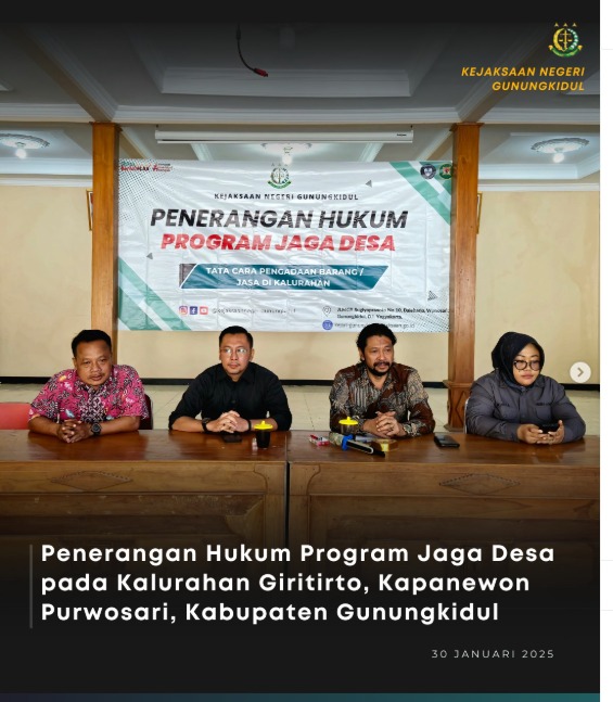 Kamis, 30 Januari 2025 Bidang Intelijen Kejaksaan Negeri Gunungkidul melaksanakan Kegiatan Penerangan Hukum Program Jaga Desa bertempat di Balai Kalurahan Giritirto, Kapanewon Purwosari, Kabupaten Gunungkidul.