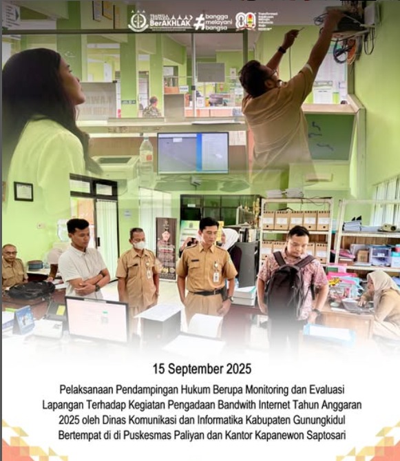 Pada hari Senin, 15 September 2025 bertempat di Puskesmas Paliyan dan Kantor Kapanewon Saptosari Kabupaten Gunungkidul, Ni Made Sukreni Gadis Bali, S.H., M.H. dan Andika Pratama, S.Kom. mewakili Heri Setiawan, S.H., M.H. selaku Jaksa Pengacara Negara telah melaksanakan Pendampingan Hukum berupa Monitoring di lapangan terhadap Kegiatan Pengadaan Bandwidth Internet Tahun Anggaran 2025 oleh Dinas Komunikasi dan Informatika Kabupaten Gunungkidul, adapun pendampingan ini dilaksanakan dengan tujuan agar memitigasi atau mengurangi risiko hukum serta memastikan pelaksanaan kegiatan sesuai dengan peraturan perundang-undangan yang berlaku guna tepat mutu, sasaran, dan bermanfaat.