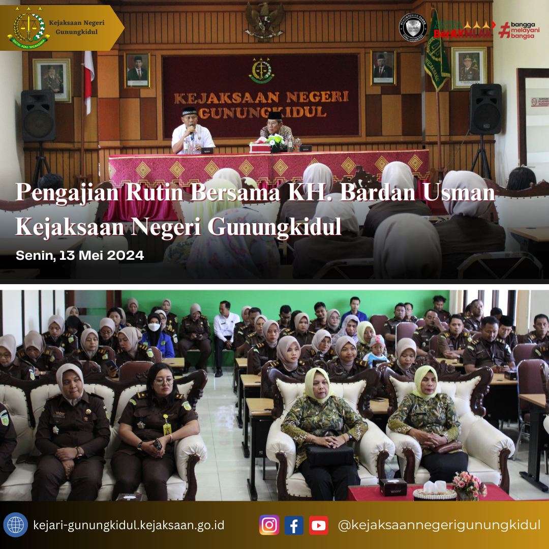 Pengajian Rutin Bersama KH. Bardan Usman Kejaksaan Negeri Gunungkidul 14/05/2024oleh admin-2421 Dilihatoleh admin Senin, 13 Mei 2024. Pengajian Rutin Bersama KH. Bardan Usman Post Views: 2,421 Jangan LewatkanPenyuluhan HukumNegosiasi dengan PKBU (Pemberi Kerja / Badan Usaha)Apel PagiNegosiasi dengan DebiturOlahraga Bersepeda Santai