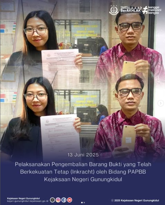 Pada hari Jum’at, Tanggal 13 Juni 2025, Bidang Pemulihan Aset dan Pengelolaan Barang Bukti (PAPBB) Kejaksaan Negeri Gunungkidul telah melaksanakan pengembalian Barang Bukti yang sudah mempunyai kekuatan Hukum Tetap a.n terdakwa Rizki Hidayat Bin Budi Prayitno berupa :