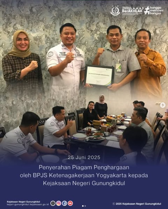 Pada hari Rabu, tanggal 25 Juni 2025 bertempat di Kurnia Seafood Yogyakarta, Tomy Novendri, S.H., M.Kn., selaku Kepala Seksi Perdata dan Tata Usaha Negara telah menerima Piagam Penghargaan yang diberikan oleh BPJS Ketenagakerjaan Yogyakarta. Adapun penghargaan tersebut diberikan kepada Kejaksaan Negeri Gunungkidul atas Komitmen dan Kerjasama dalam pelaksanaan Penegakan Hukum Program Jaminan Sosial Ketenagakerjaan diwilayah Kabupaten Gunungkidul.