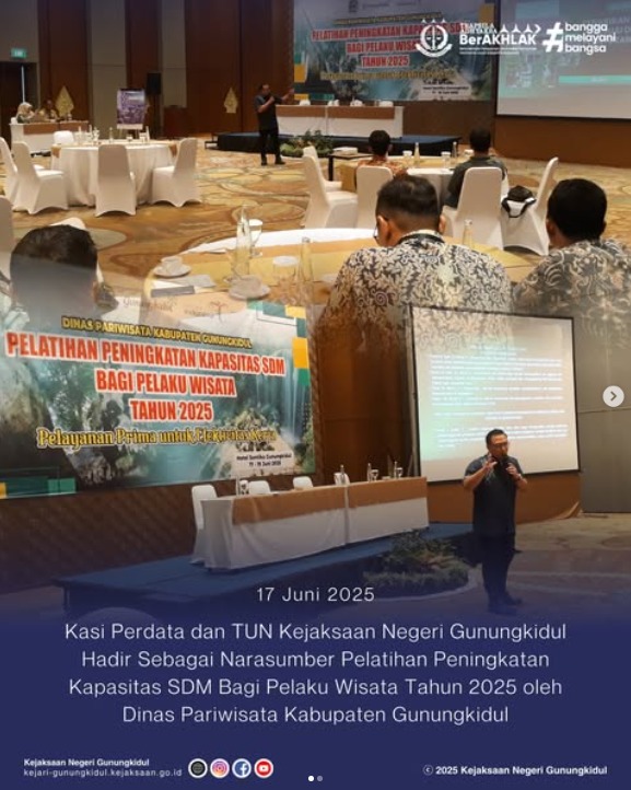 Selasa (17/06/2025) hadir Tomy Novendri, S.H., M.Kn., Kasi Perdata dan TUN Kejaksaan Negeri Gunungkidul sebagai Narasumber dalam acara Pelatihan Peningkatan Kapasitas SDM Bagi Pelaku Wisata Tahun 2025 oleh Dinas Pariwisata Kabupaten Gunungkidul, bertempat di Hotel Santika, Playen, Gunungkidul.