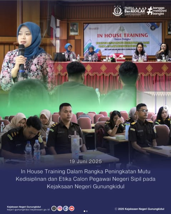 Pada hari Kamis (19/06/2025) telah dilaksanakan kegiatan In House Training dalam rangka Peningkatan Mutu Kedisiplinan dan Etika Calon Pegawai Negeri Sipil pada Kejaksaan Negeri Gunungkidul bersama dengan PT. BPR Bank Daerah Gunungkidul. Kegiatan diikuti oleh lima belas peserta CPNS Tahun 2025, bertempat di Aula Kantor Kejaksaan Negeri Gunungkidul.