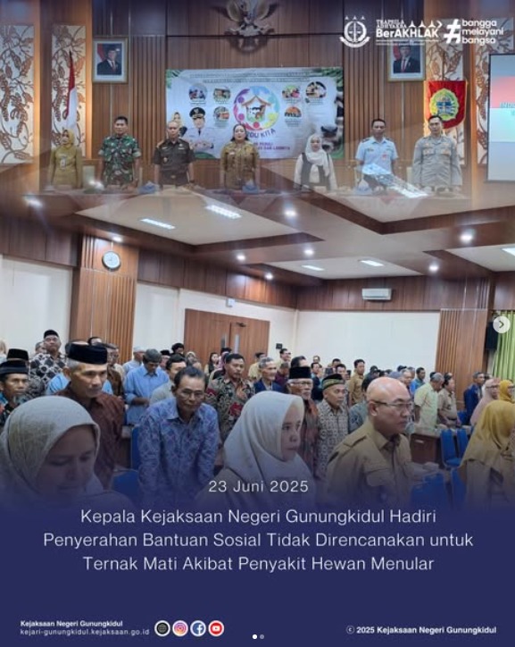 Kepala Kejaksaan Negeri Gunungkidul, Slamet Jaka Mulyana, S.H., M.H. bersama jajaran Forkopimda hadiri acara Penyerahan Bantuan Sosial Tidak Direncanakan untuk Ternak Mati Akibat Penyakit Hewan Menular oleh Bupati Gunungkidul, pada Senin (23/06/2025) bertempat di Ruang Rapat Handayani, Sekretariat Daerah Kabupaten Gunungkidul. Acara tersebut diselenggarakan sebagai tindak lanjut pelaksanaan Peraturan Bupati Nomor 10 Tahun 2025 tentang Tata Cara Pemberian Kompensasi dan/atau Bantuan Pemberantasan Penyakit Hewan Menular dan Tata Cara Pemberian Kompensasi Hewan Sehat Akibat Depopulasi.